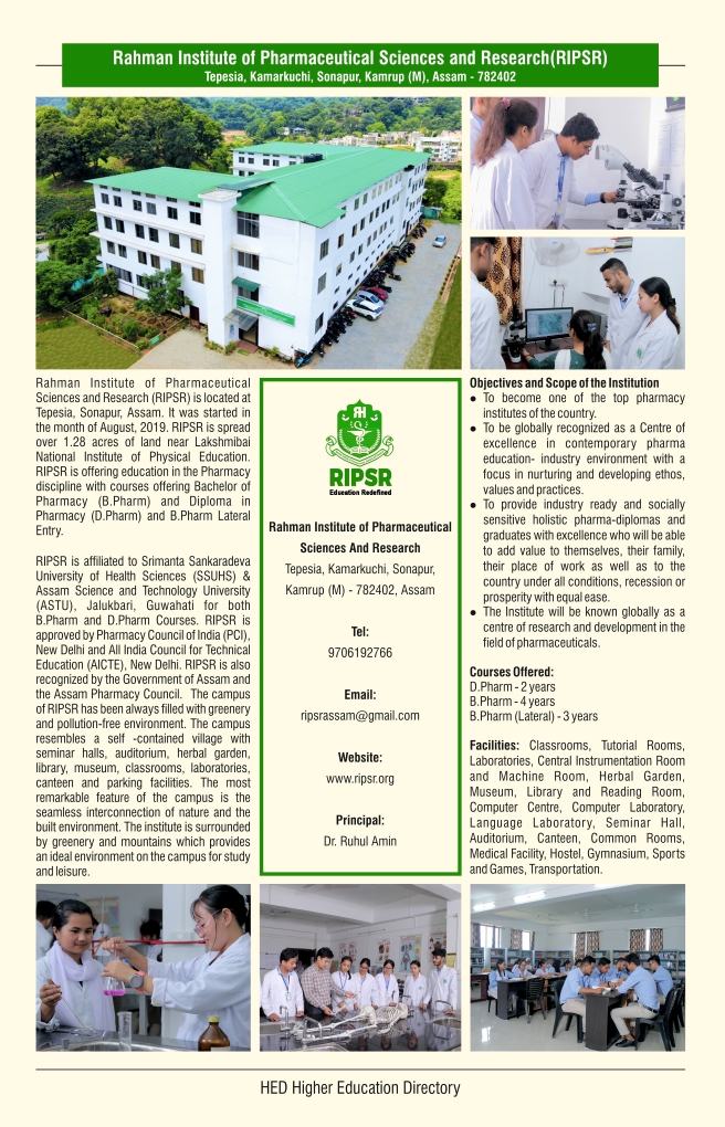 Rahman Institute of Pharmaceutical Sciences and Research (RIPSR) is located at Tepesia, Sonapur, Assam. It was started in the month of August, 2019. RIPSR is spread over 1.28 acres of land near Lakshmibai National Institute of Physical Education. RIPSR is offering education in the Pharmacy discipline with courses offering Bachelor of Pharmacy (B.Pharm) and Diploma in Pharmacy (D.Pharm) and B.Pharm Lateral Entry.